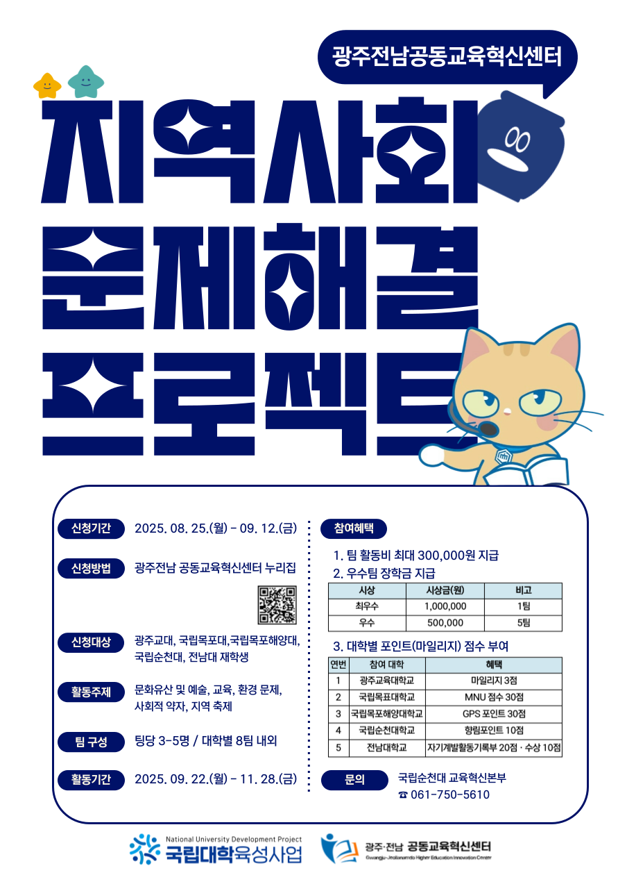참여 혜택 | 팀 활동비: 최대 30만원 지원 활동보고서 4회 및 최종보고서를 제출한 재학생 대상 대학별 포인트(마일리지) 부여 광주교육대학교: 마일리지 3점 국립목포대학교: MNU 점수 30점 국립목포해양대학교: GPS 포인트 30점 국립순천대학교: 향림포인트 10점 전남대학교: 자기계발활동기록부 20점, 수상 10점 |
